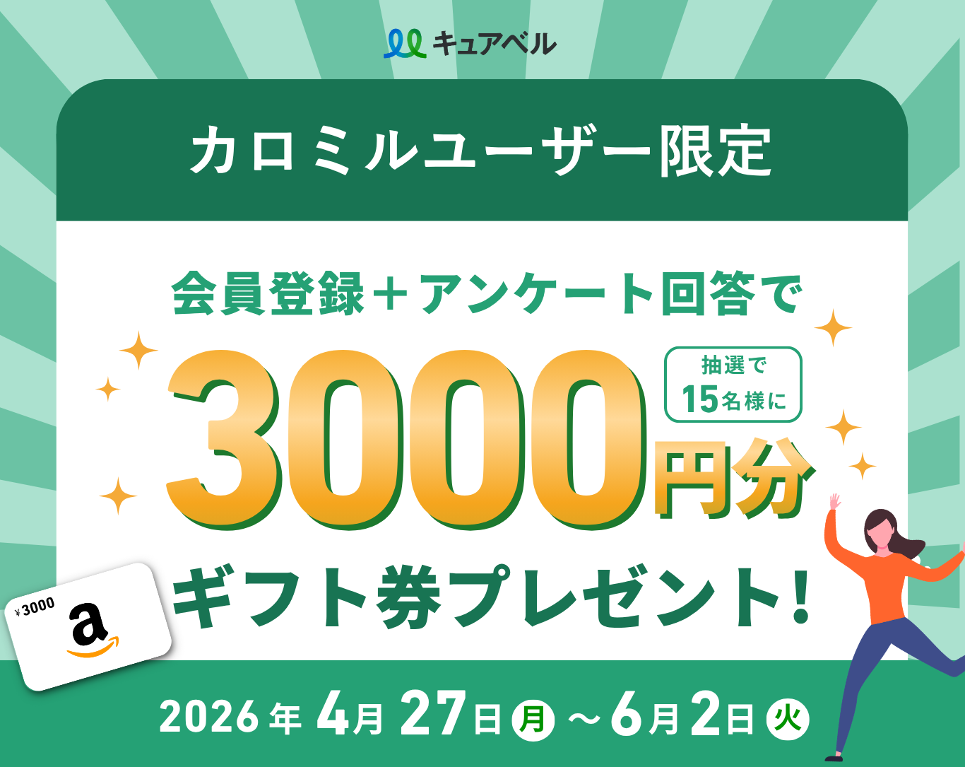 ご登録いただいた個人情報は、本キャンペーンの抽選・賞品発送、およびキュアベルのサービス運営のために利用いたします。